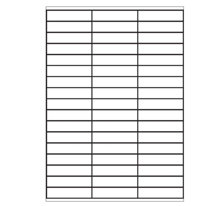 Selbstklebende, mattweiße Etiketten auf A4-Bögen. Abmessungen: 70 x 16,9 mm. 51 Etiketten pro Bogen. Verpackt pro 100 Blatt (5100 Etiketten). Das Papiergewicht der Etiketten beträgt 68 g/m² und des Backsheets 55 g/m².